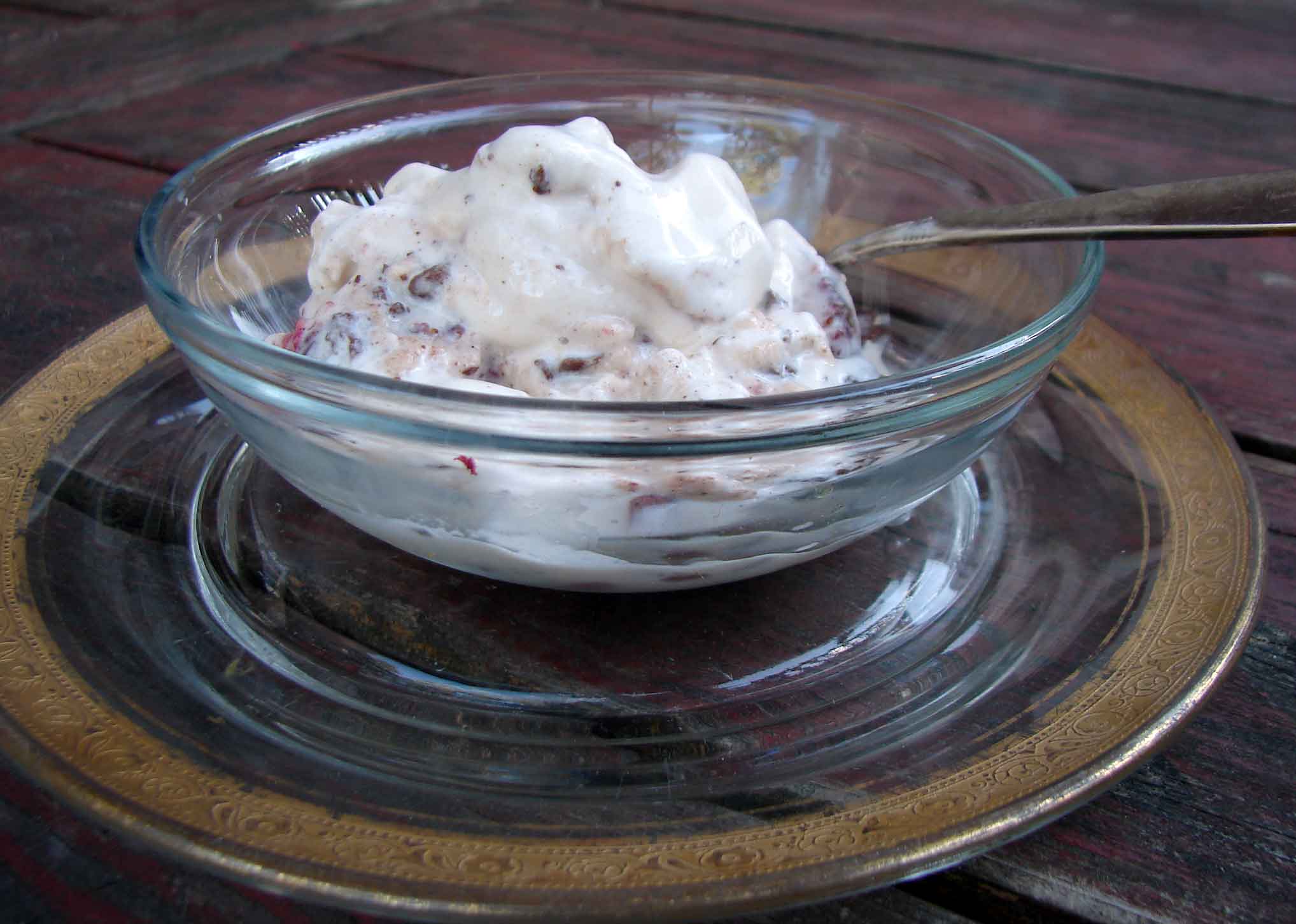 **update** We tried this again last night, but we didn’t whip the cream before we stirred it in (Malcolm’s suggestion). It might have turned out even creamier. If you whip the cream it’s like a frozen mousse, which is nice, but if you don’t, it might feel more like authentic ice cream. Nice both ways!