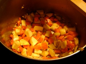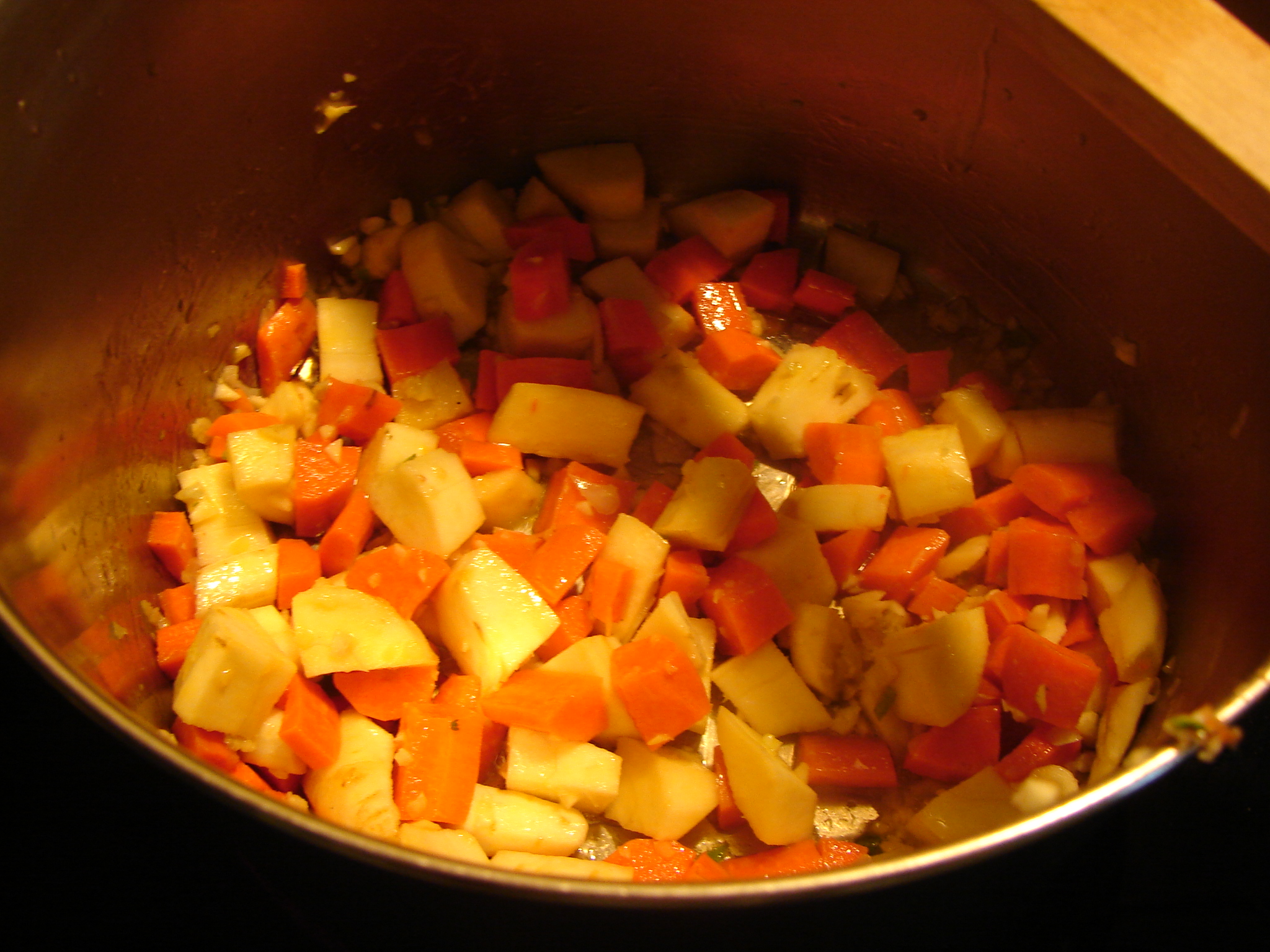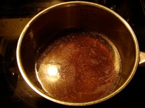 We got some garlic scapes from our CSA. They’re the lovely, long, curly green stems of garlic bulbs, which taste like a milder, sweeter garlic. They can still be quite pungent, raw, but in this dish they’re stewed in delicious broth for some time, so they become soft and sweet. They go nicely with black barley, which has a nice, nutty flavor. You could easily use regular barley or arborio rice to make this, and it would take less time and probably be creamier. But it wouldn’t have that distinctive deep, black barley flavor and color. It did take more than an hour for all the broth to be absorbed, but you don’t have to stir it the whole time. The barley almost spoke to me, as I made this … as soon as I heard the barley sizzling in the dry pan, I knew it was time to add more broth. It told me when it was ready! As ever, the broth is quite important in a risotto. In order to make it, well, meaty, I used a little marmite, a little tamari, some tomato paste, and a handful of french lentils. You could use whatever you have on hand, though!