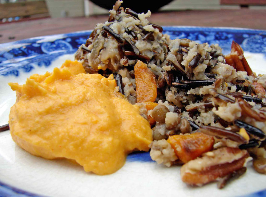 I like wild rice, but I don’t cook it very often, because I’m so comfortable cooking basmati, that it’s a worry-free situation for me. Quick, tasty and dependable. This dish combines wild rice with basmati and french lentils. It’s very autumnal, especially with the addition of roasted butternut squash and mushrooms, and the flavorings of sage and rosemary. I thought this was really tasty – savory, a bit sweet, a bit smoky with the cheese. Comforting! I made a purée of cauliflower and carrots to go with this, and flavored it with sweet smoky spices like cardamom and ginger. Sweet and soft where the rice is earthy and full of texture. A nice combination!