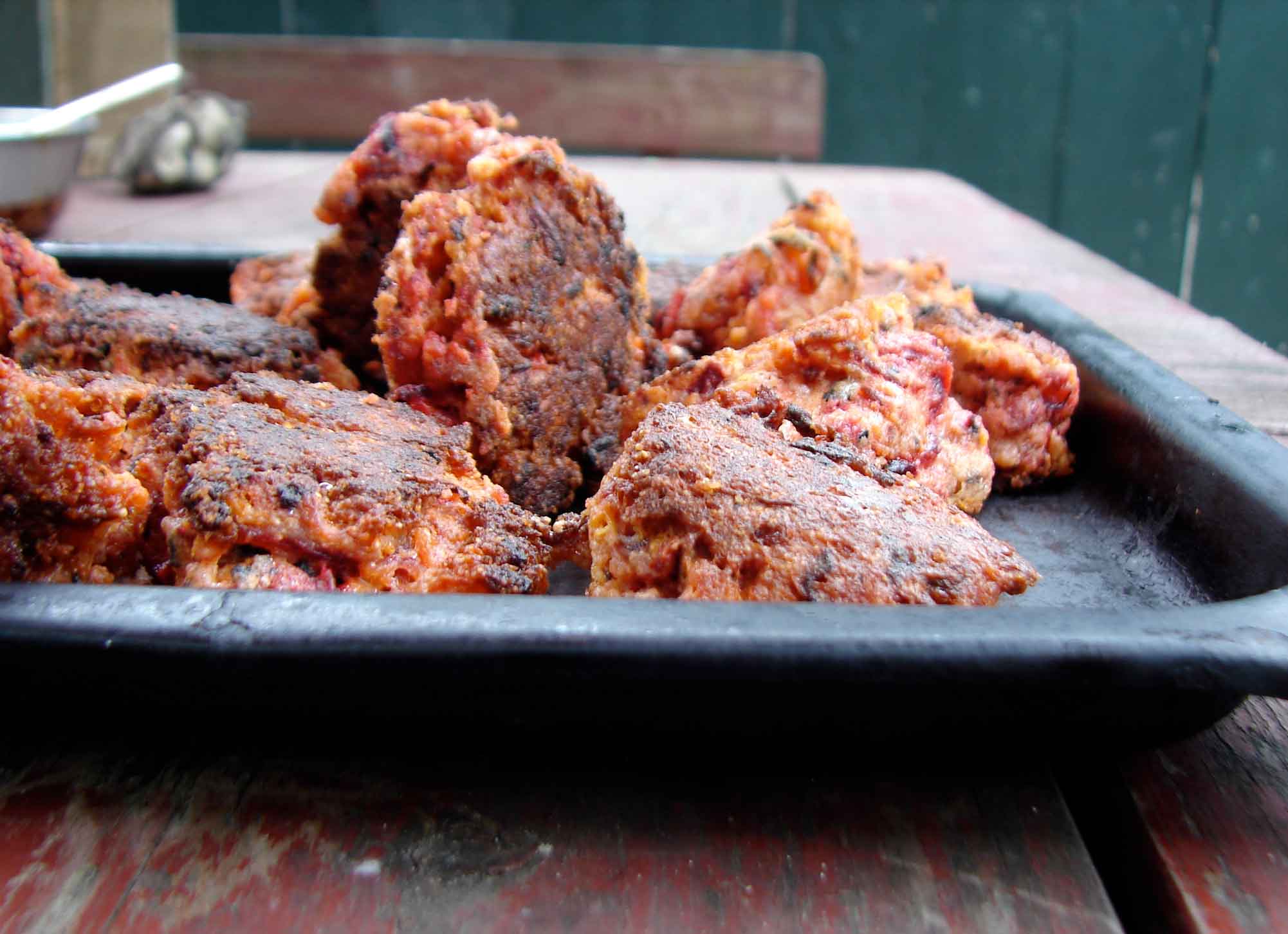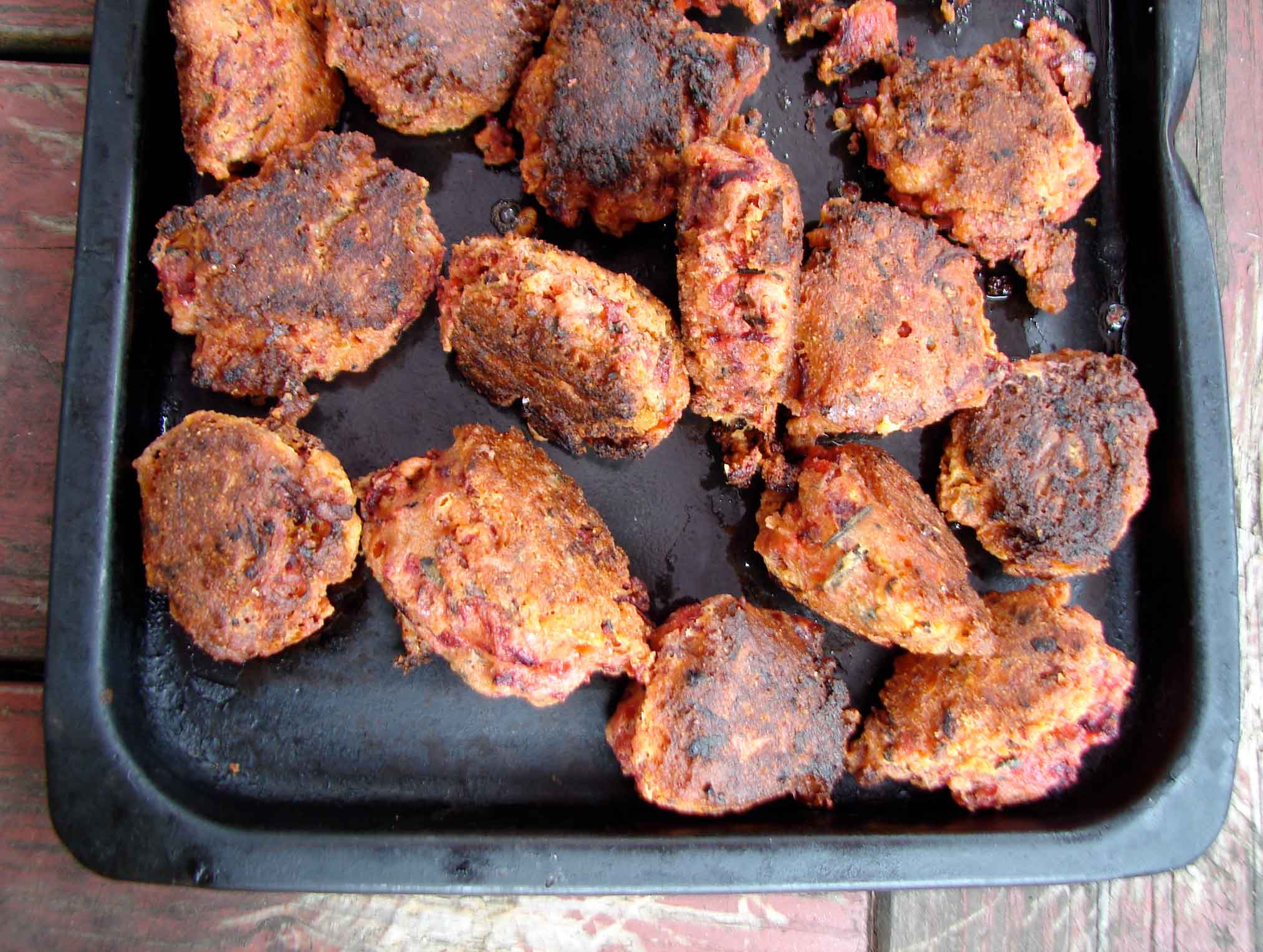 Beets beets and more beets from the CSA! I wanted to do something different with them, other than just roasting them. Well, I roasted them, and then I mixed them with a batter of semolina flour and ricotta and dropped them in some hot olive oil. Beet balls! I thought they were delicious, and the boys liked them a lot, too. Light and tender on the inside, crispy on the outside. I flavored them with smoked paprika and a pinch of nutmeg. They’d be nice with any kind of sauce, either to serve them in or to dip them in. A creamy nut sauce, a simple tomato sauce, a pesto, a spicy catsup,